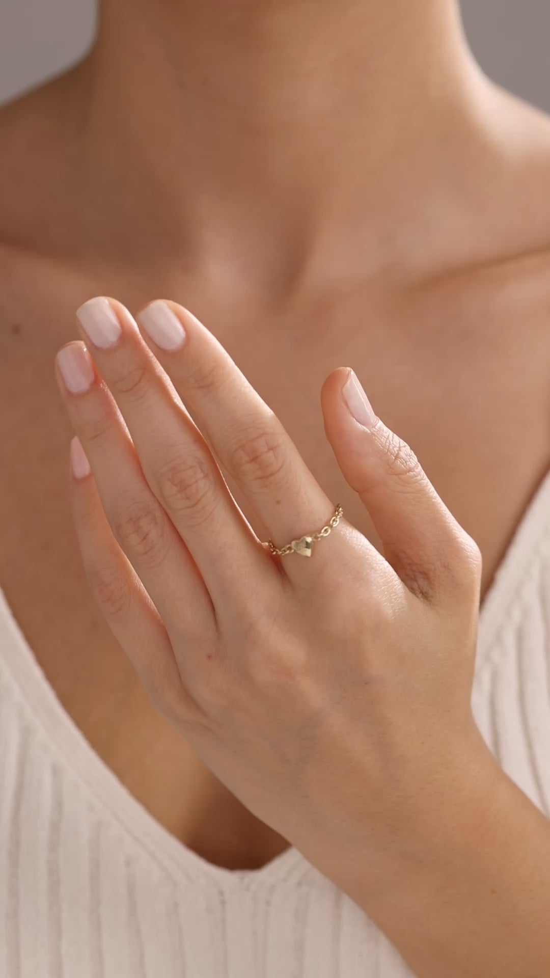 A delicate 14K solid gold ring featuring a dainty heart charm on a fine chain band. Perfect for everyday wear, stacking, or gifting to someone special.